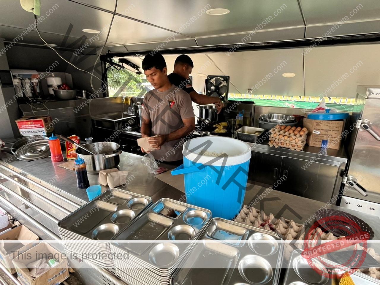 Pantauan di lokasi, Kamis (15/1), dua personel Polri terlihat bersiaga di dapur mobile. Seorang personel membungkus nasi dan lauk, sementara personel lainnya memasak di depan kompor untuk memastikan ketersediaan makanan bagi warga yang datang silih berganti.