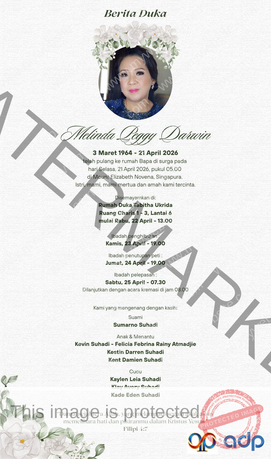 JAKARTA RAYA – Kabar duka menyelimuti keluarga besar Melinda Peggy Darwin yang meninggal dunia dengan damai pada Selasa, 21 April 2026 pukul 05.00 waktu Singapura. Almarhumah mengembuskan napas terakhir di Mount Elizabeth Novena Hospital dalam usia 62 tahun.