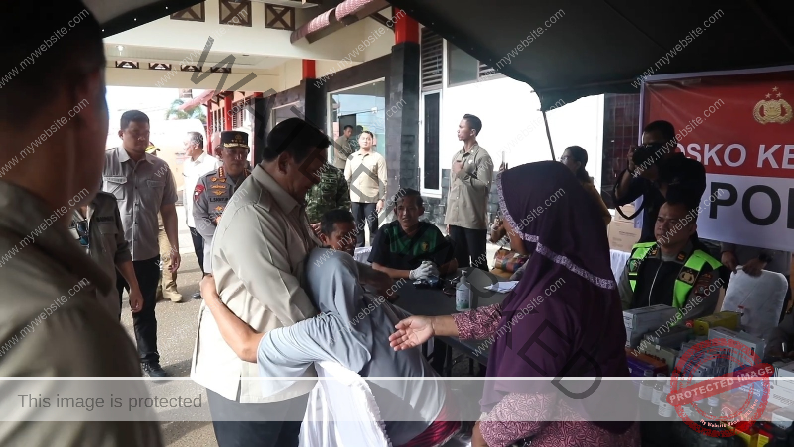 “Ibu sehat ya,” ucap Prabowo kepada seorang ibu yang sedang mengecek kesehatannya di posko bencana GOR Pandan itu.