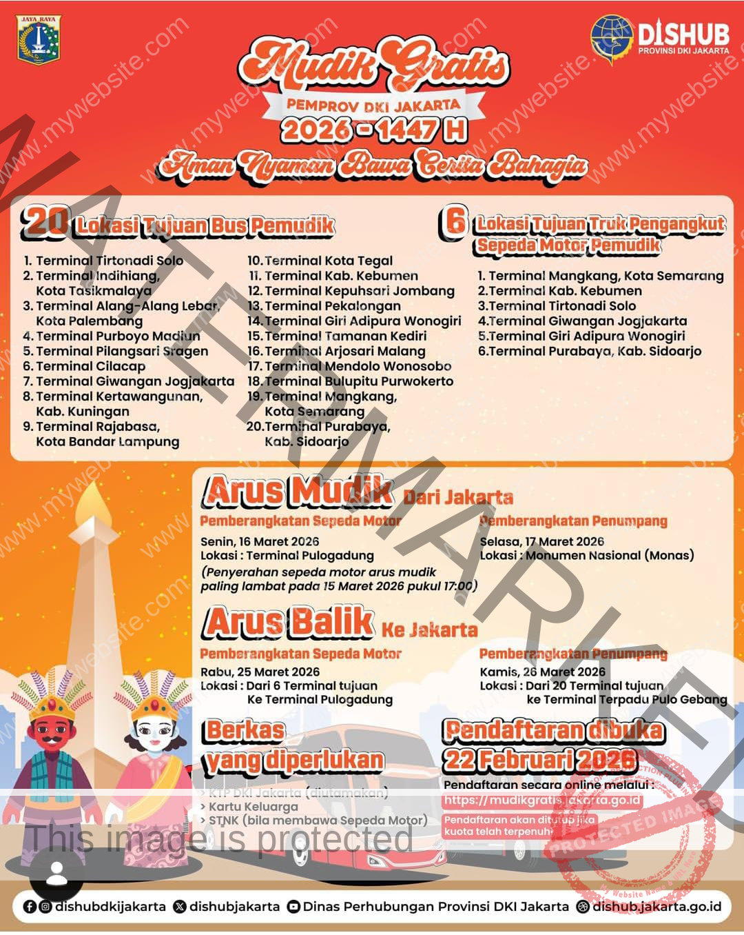 Pendaftaran akan ditutup apabila kuota mudik gratis telah terpenuhi. Selanjutnya, pemberangkatan penumpang mudik gratis akan dilaksanakan pada Selasa, 17 Maret 2026 dari kawasan Monas.